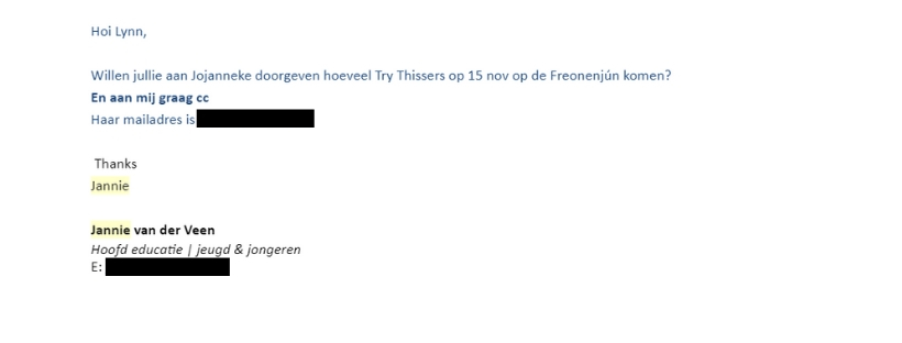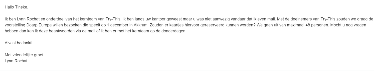Mijn taak hierin was het bellen naar scholen om te vragen of er de mogelijkheid was om langs te komen om te gaan werven. Daarnaast heb ik binnen Tryater contact gehad om vragen te stellen, hoe de gang van zaken was of als we wat nodig hadden.